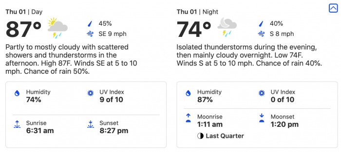 The week continues with another similar day (Honestly, we’re getting suspicious at how consistent these predictions are). We’ll see high-80s in the day and a mid 70s night on July 2nd.