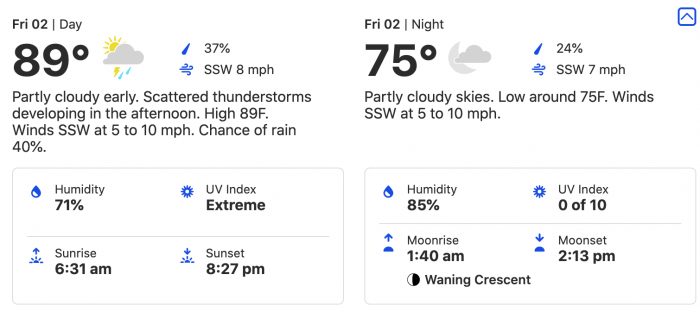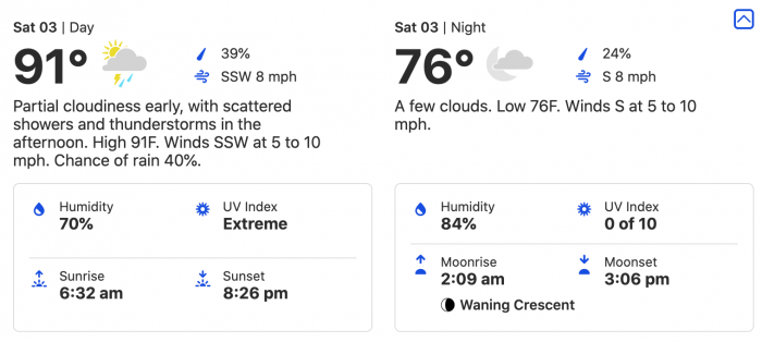 Here, we’ll see a 91-degree high and a 76-degree low.
