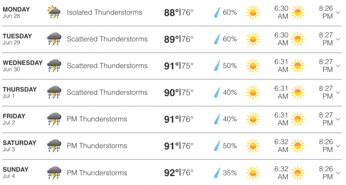 Here is a full overview of the week according to The Weather Channel. Temperatures are projected to hang out in about the same place for the whole week. We’re looking at a range of 80s to 90s highs and 70s lows.
