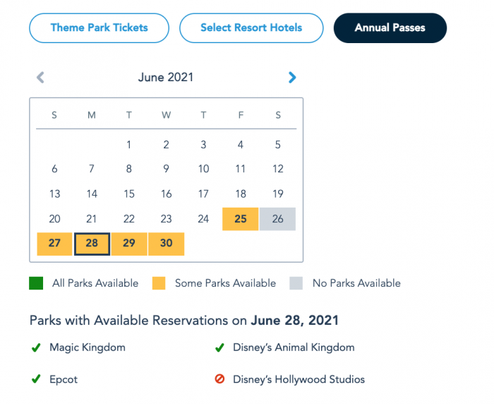 Park Pass Reservation availability for guests with Theme Park Tickets on June 28th as of June 25th © Disney