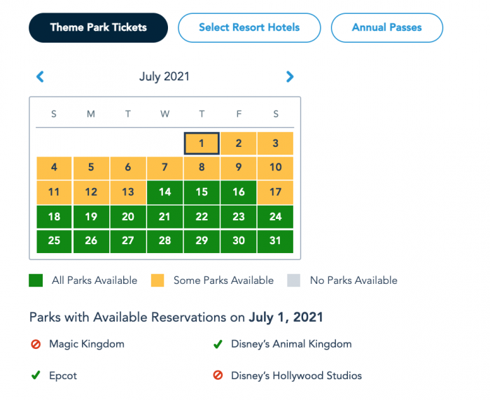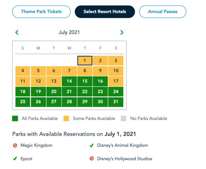 Park Pass Reservation availability for guests staying at Select Resort Hotels on July 1st as of June 25th © Disney