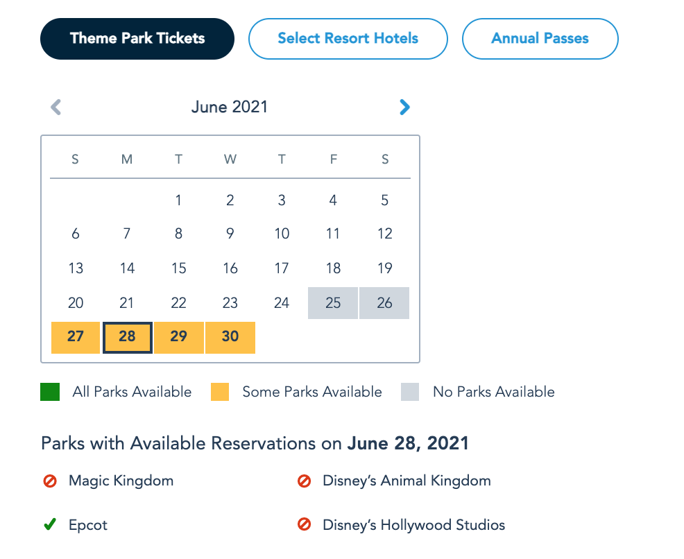 Guests with Theme Park Tickets have identical Park Pass Reservation availability for the week of June 27th. On Sunday, June 27th and June 30th, guests with Theme Park Tickets can book a Park Pass Reservation at EPCOT and Disney’s Animal Kingdom.