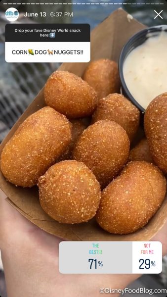 The Corn Dog Nuggets got 71% of your support! With Casey’s Corner currently closed, you can get Corn Dog Nuggets served with a side of cheese dip from Westward Ho in Frontierland in Magic Kingdom for $6.99.