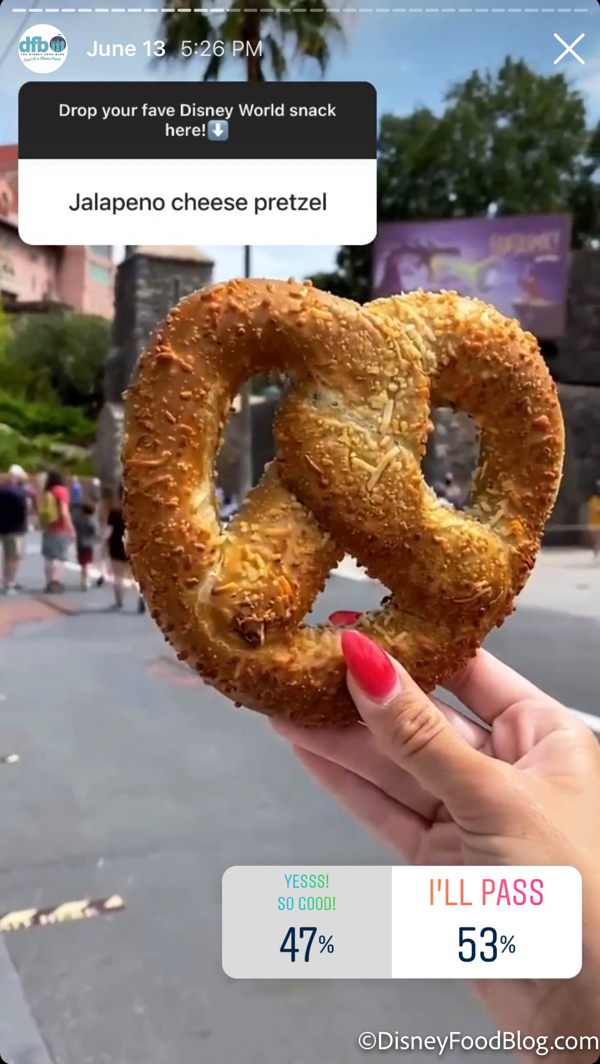 The Cheddar-Jalapeño Pretzel came in with the lowest ranking of all the Disney snacks. 53% of you said you’d pass on this savory treat. This pretzel is stuffed with creamy jalapeño cheese and is one of the more difficult-to-find pretzels in Disney Parks. It’s available at the Pretzel Palooza in Disney’s Hollywood Studios for $7.25.
