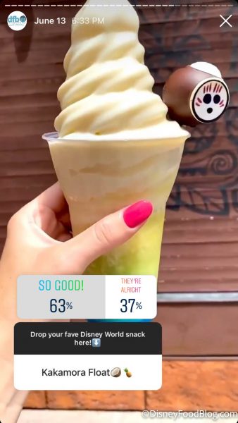 Next, we have the Kakamora Float, which was voted so good by 63% of you! This float is based on the Kakamora characters from Moana and only recently returned to Magic Kingdom! Similar to the Dole Whip, the Kakamora Float is coconut soft-serve with pineapple juice and blue curaçao. And don’t forget the chocolate Kakamora cake pop! You can find it at Aloha Isle in Magic Kingdom for $6.99.
