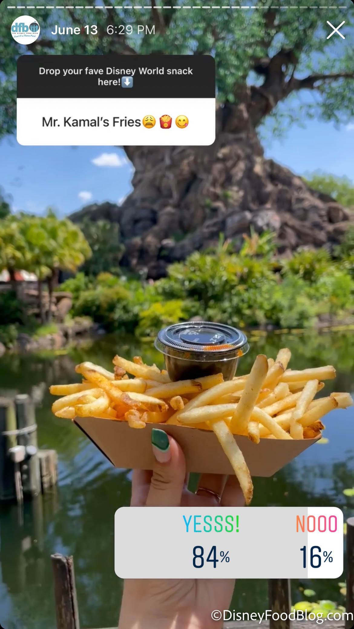 Mr. Kamal’s Fries came in with an enthusiastic 84% of you saying, yesss! Mr. Kamal’s Seasoned Fries can be found at Mr. Kamal’s, a small kiosk located in Animal Kingdom between Asia and Africa. For $5.99, you can gobble up these seasoned fries served with tzatziki salad and Sriracha ketchup.