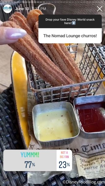 Now we return to Animal Kingdom for the Nomad Lounge Churros. 77% of you say YUM to these churros. These cinnamon sugary churros are served with vanilla bean and strawberry chili dipping sauces for $9. The Nomad Lounge is located in Discovery Island right next to Tiffins.