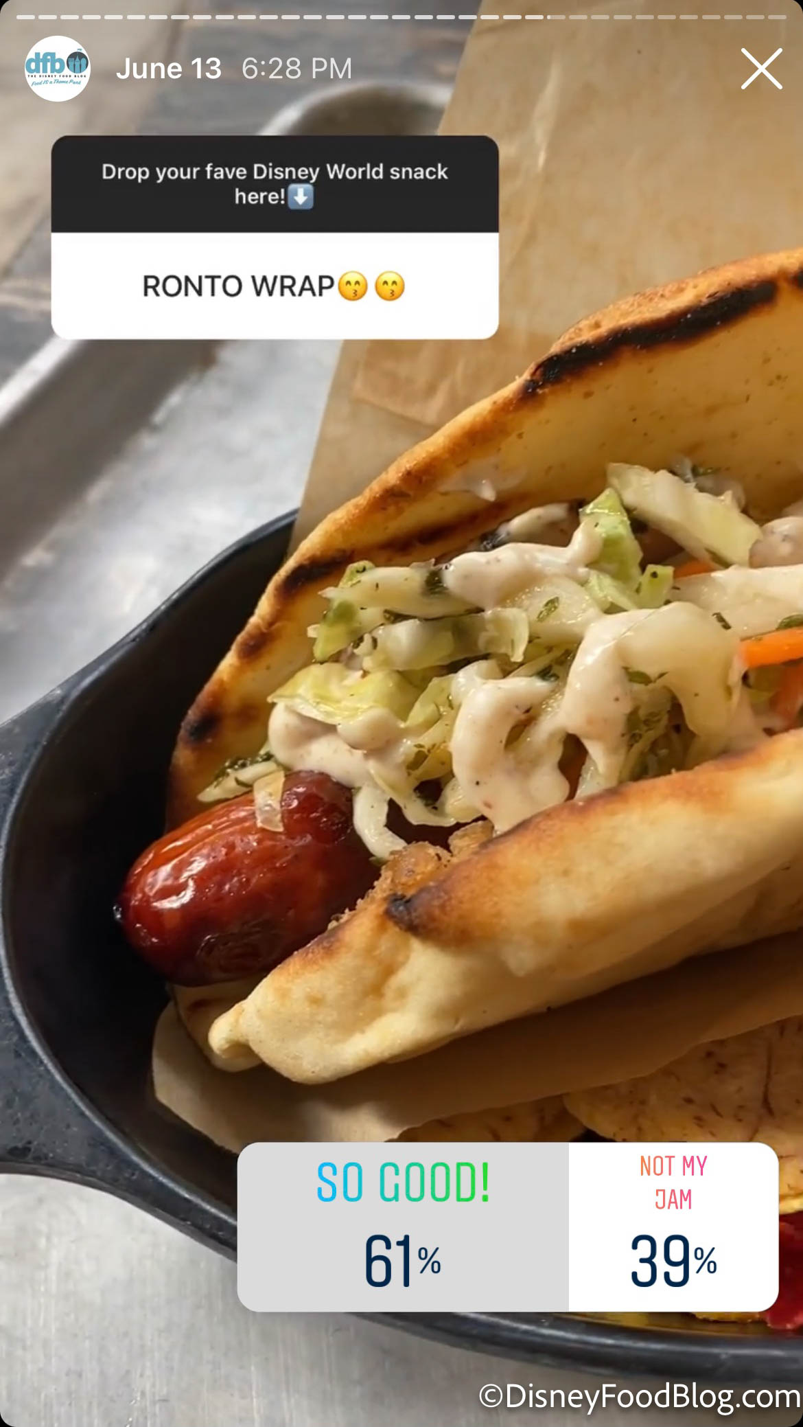 Next, we have a tie! 61% of you love the Ronto Wrap from Ronto Roasters. The Ronto Wrap comes in a pita with pork, slaw, and peppercorn sauce for $12.99. Ronto Roasters is located in Star Wars: Galaxy’s Edge in Hollywood Studios.