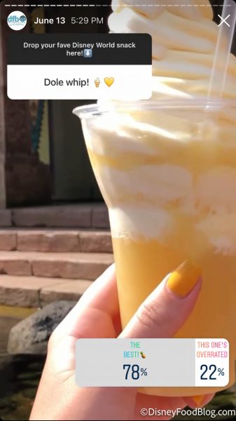 Surprising probably no one is the Dole Whip coming in with a strong 78% vote. The Dole Whip is a Disney Park staple and you can even get 10 different flavor combos. You can find the classic Pineapple Dole Whip at Aloha Isle in Adventureland in Magic Kingdom for $4.99.