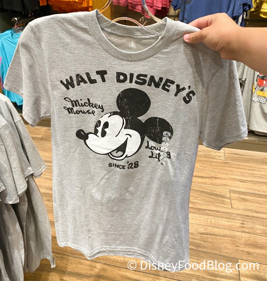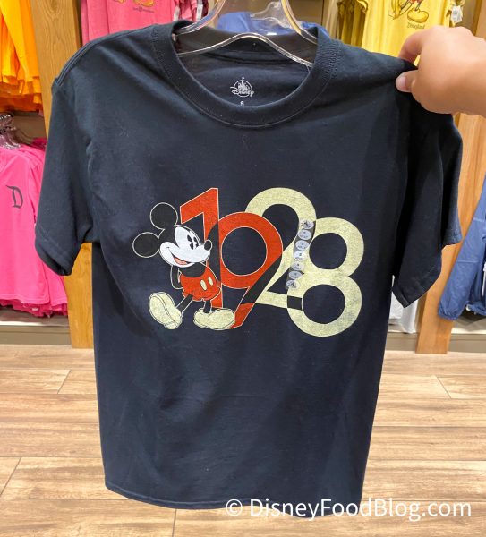 We spotted a few new Mickey Mouse-inspired t-shirts at World of Disney this week! First up is this men’s t-shirt that features Mickey Mouse and the year Mickey first appeared, 1928!