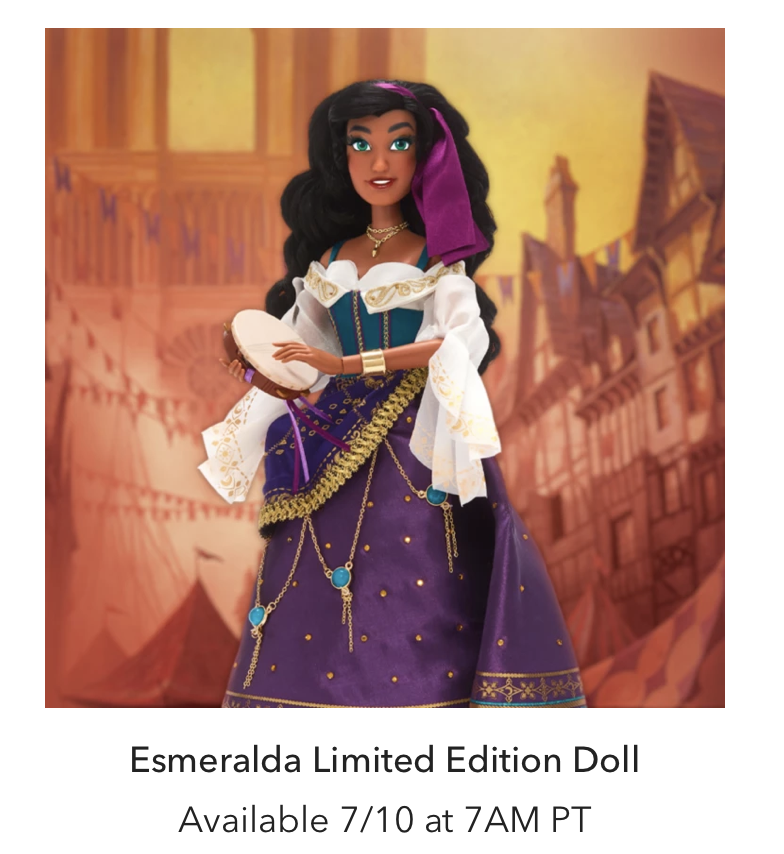 The Esmeralda Limited Edition Doll will be on shopDisney on July 10th at 7AM PT. Stay tuned to DFB as we learn more about the pricing and the limited number of dolls available!
