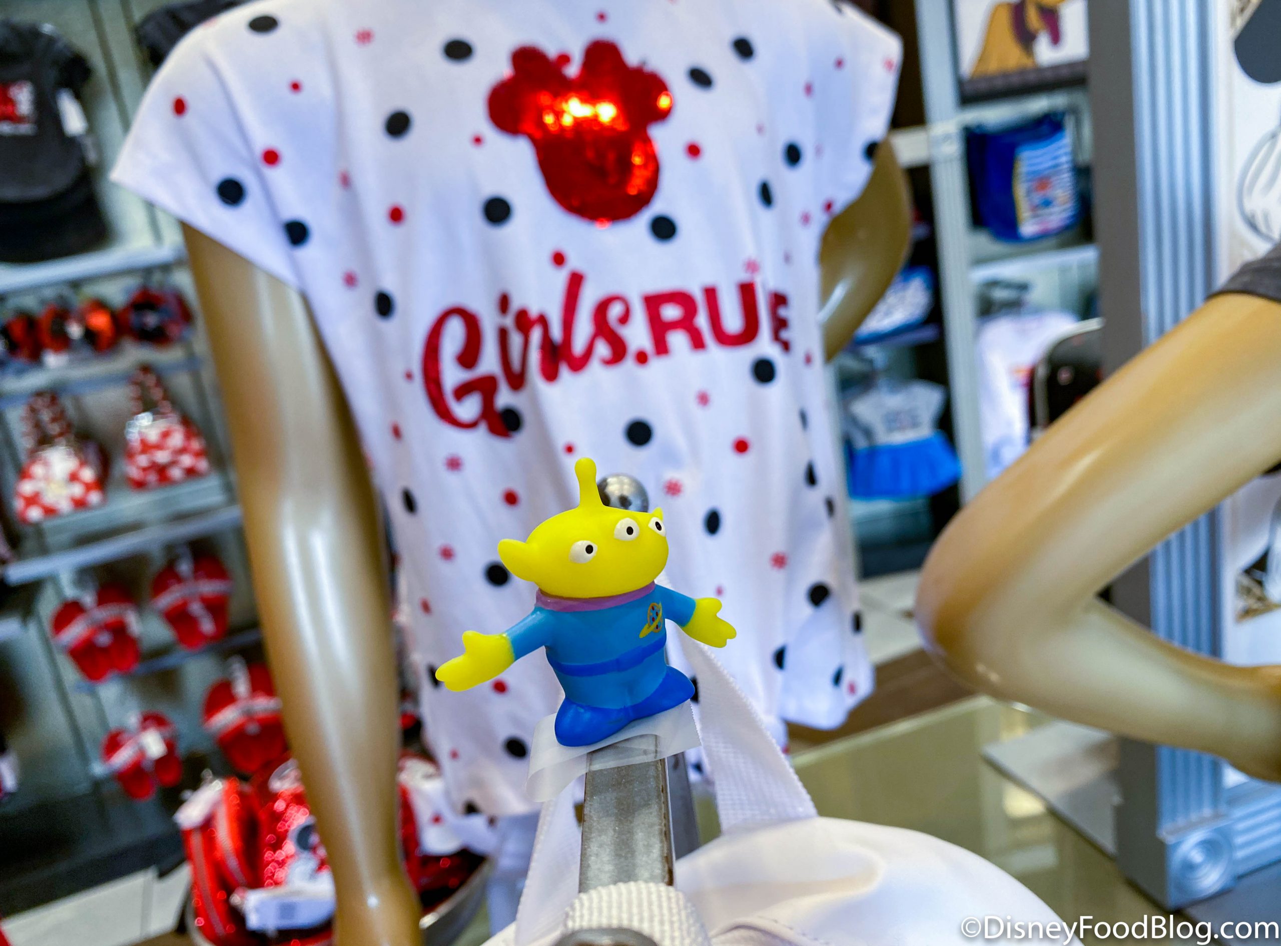 Scattered throughout a display there were some green Aliens from Toy Story.