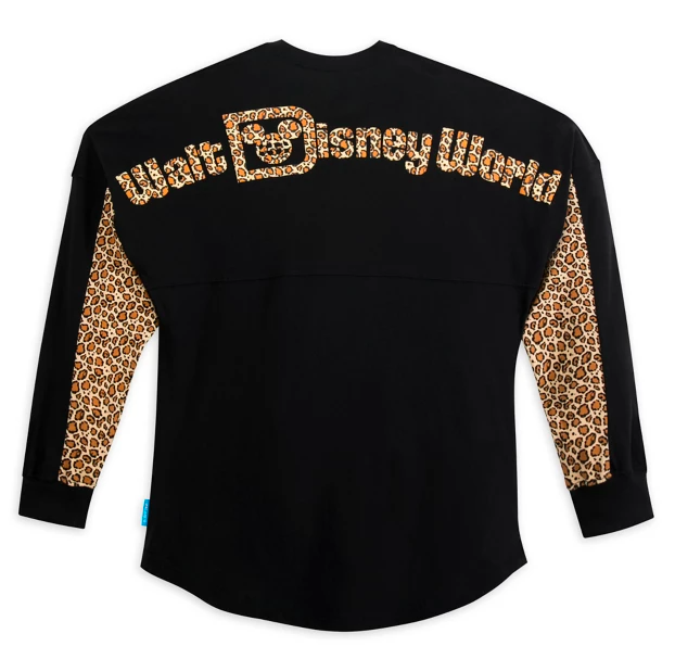 The spirit jersey is long-sleeved with mostly black fabric, except for the bright cheetah-print along the inside of the sleeves! There’s a Mickey on the front, and his shorts are also cheetah-print! On the back, there’s a raised cheetah-print “Walt Disney World” and more animal print on the sleeves!