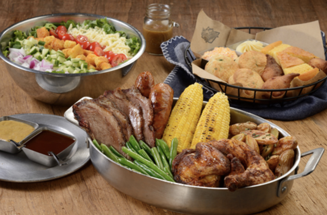 Then enjoy the family-style Smokehouse Skillet that comes with pecan-smoked brisket, rotisserie chicken, andouille sausage, fingerlings potatoes, green beans, and buttered corn on the cob. You can get pork spare ribs, peel n’ eat shrimp, and cornbread-crusted salmon as add-ons to your meal.