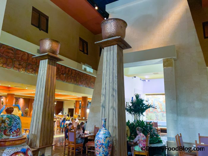 The decor is what you would expect from a grand Mexican dining room — you’ll see a lot of Mayan motifs that include images of sun, water, and fire.