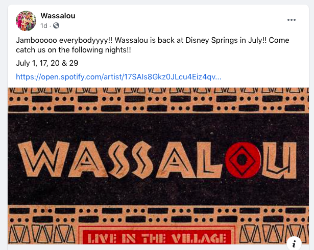 Wassalou is a contemporary Afropop band that performed daily in Disney’s Animal Kingdom at Harambe Village. You might have seen them performing on the stage close to the entrance of Kilimanjaro Safaris! They haven’t been performing there recently, as they stopped performances due to health and safety precautions. But they’ll be coming back soon! Just not to the same stage…for now.
