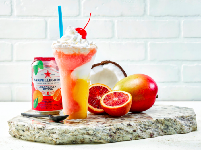 It all sounds delicious, but we’ve got our eye on one treat in particular: the Tropicale Float! This float is made from coconut sorbetto, mango sorbetto, and San Pellegrino Aranciata Rossa, then topped with whipped cream and a cherry!