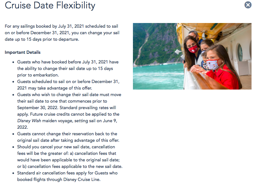 Cruise Date Flexibility has also been extended for more cruises. For any sailings booked by July 31st, 2021, scheduled to sail on or before December 31st, 2021, guests will be able to change their sail date up to 15 days prior to departure.