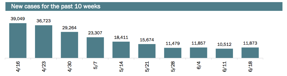 This number of new weekly cases for COVID-19 is actually an increase in the number of cases seen from the previous week and one of the higher numbers seen recently. For the week of 6/11, the number of new cases was 10,512. The week before that had 11,857 cases, and the week before that was at 11,479 cases. So this past week’s total number of new cases (11,873) is actually the highest number of cases seen in recent weeks.