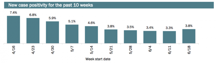 The new case positivity rate is also up. During this last week, the positivity rate was 3.8%. The weeks before that were at 3.3%, 3.4%, and 3.5%. So again, this is the highest number seen for a number of weeks.
