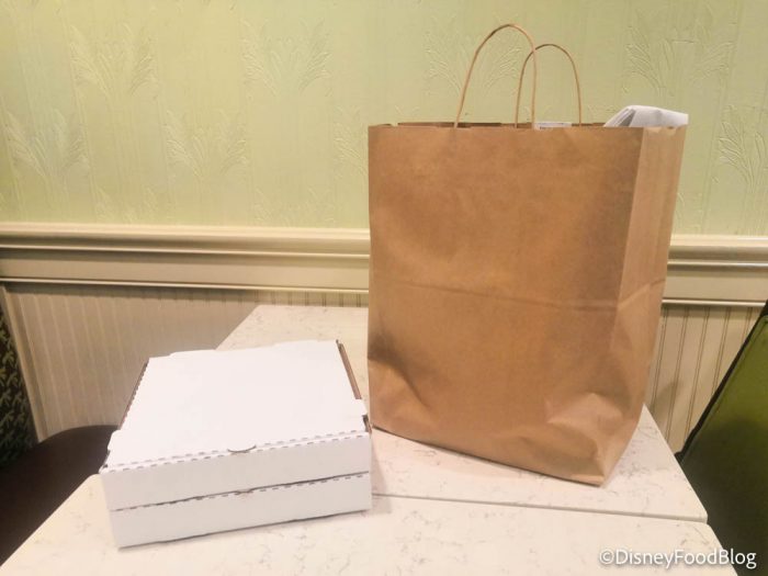 The meal comes out in a large to-go bag and two small pizza boxes, so you can take it wherever you’d like to enjoy your giant dinner with your family.