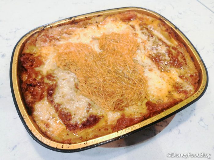 Next up, we tried the Lasagna! Like we said, this meal has lots and lots of hidden Mickeys, so there is a parmesan Mickey on top! The lasagna is pretty delicious, but we did sense a bit of that reheated taste like when you make a lasagna in the oven at home. There is tons of gooey cheese and plenty of meat between the layers. If you’re a sauce person, you’ll probably want to ask for a side of marinara to make it saucier, but that’s up to you! Our biggest complaint was that the crunchy layer did not go across the whole top. The Mickey is cute and added some nice texture, but we wish it covered the entire lasagna!