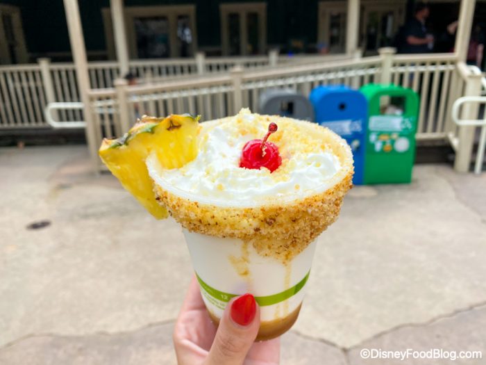It’s a vanilla milkshake with pineapple caramel sauce, cake crumb-coated rim, pineapple wedge, whipped cream, and a cherry on top!