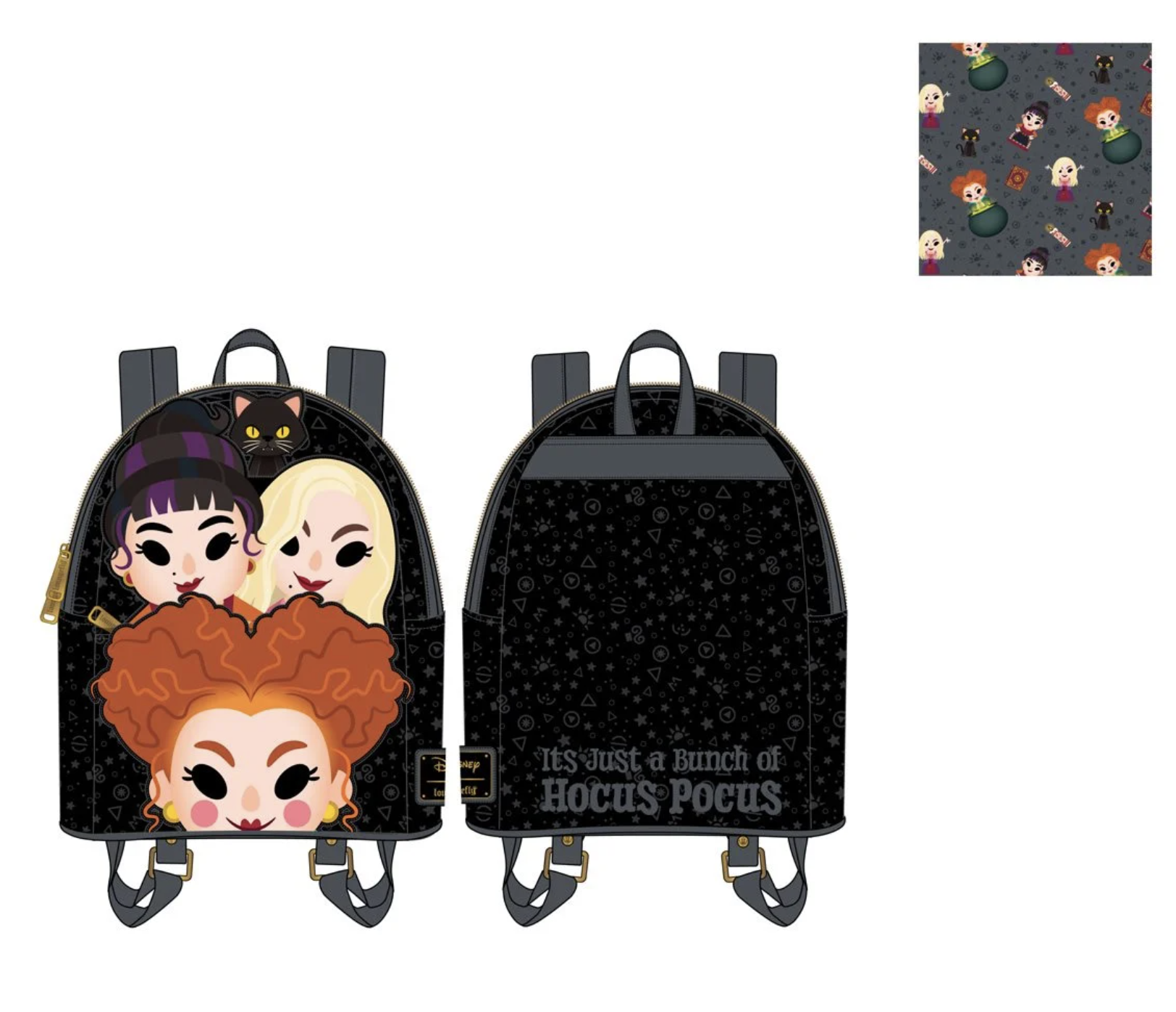 The front of this mini backpack showcases Binx peeking out from behind our favorite witchy trio, the Sanderson sisters, with “it’s just a bunch of hocus pocus” printed on the back.