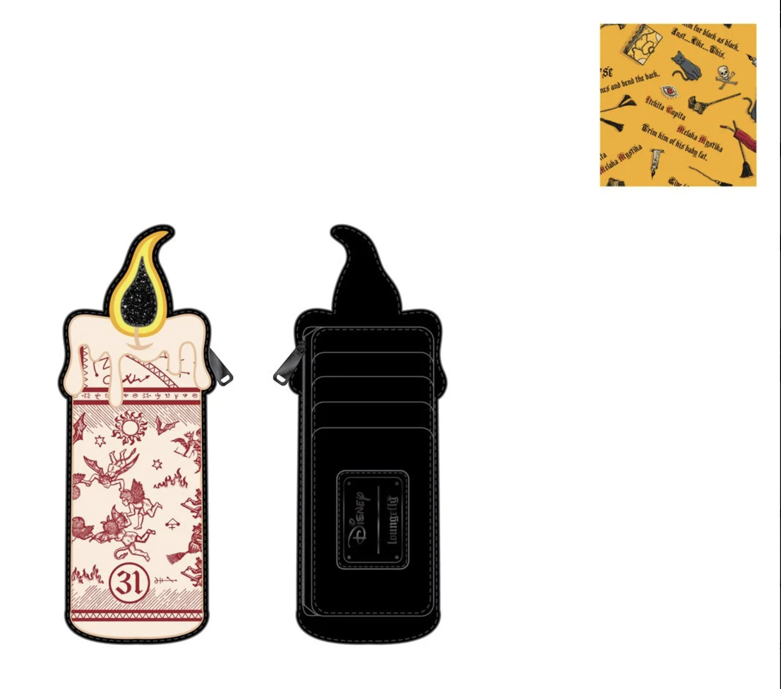 If Hocus Pocus is your favorite Halloween movie, we got you! This Hocus Pocus Binx Candle Cardholder Wallet is inspired by the movie’s black flame candle. The flame is glittery and the lining has all kinds of Hocus Pocus details like Binx!