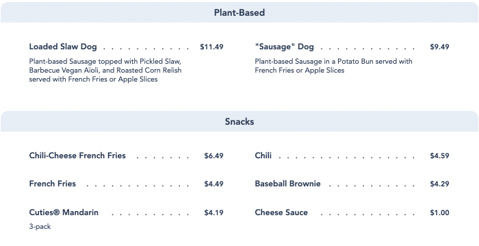 On the menu, you’ll find one specialty beverage option (the Frozen Mint Julep Lemonade) and lots of hot dog variations. There are a few former favorites missing from the menu though like the Mickey Celebration Sipper, the Bacon Macaroni & Cheese All-Beef Hot Dog, and the Bacon Macaroni & Cheese French Fries but now you’ll find an All-Beef Foot-long Hot Dog and that smaller All-Beef Hot Dog has actually gone DOWN in price from $9.99 to $9.49.