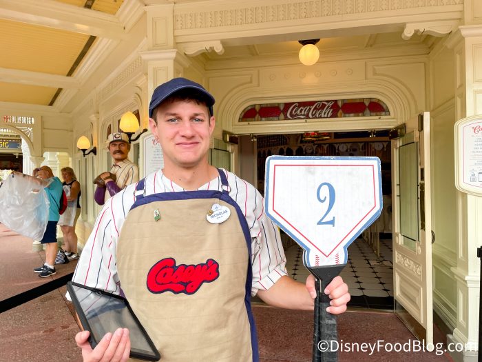 In fact, there’s even a “first pitch” that happens when the restaurant opens each day — with a real baseball and all! The first two people in line for Casey’s Corner get to show off their arm and toss the ball to a Cast Member and the tradition has returned with the reopening of the restaurant.