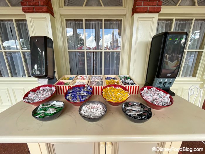 And, we were excited to see that the trays filled with complimentary water cups had returned to the restaurant! Many restaurants around Disney World offer free water, but we don’t always see the cups prepared and out on the counter. Whether the tray is out or not though, you can always ask a Cast Member for one.