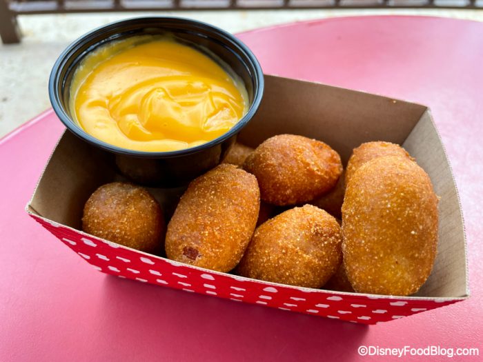 If you’ve been around DFB for a little while now then you probably know that we have a deep love and appreciation for Corn Dog Nuggets and we are soooo happy to see them back on the menu at Casey’s Corner! These guys are considered a full-on entree, so it comes with a side of cheese sauce and choice of French Fries or a Cuties Mandarin on the side for $9.99.