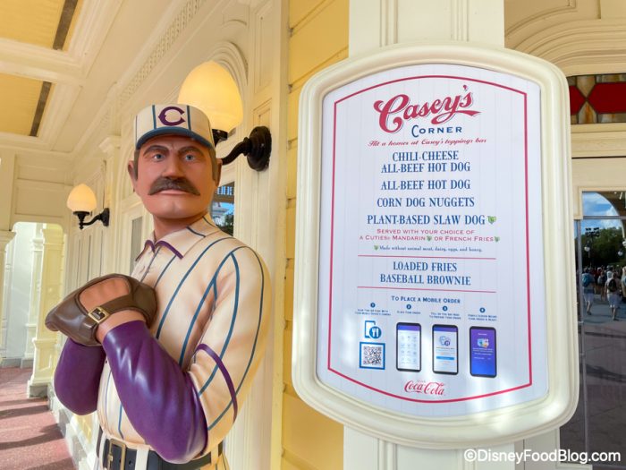 Like we mentioned before, Casey’s Corner is currently only accepting Mobile Orders, so you can either search for it in the My Disney Experience app before you arrive at the restaurant or scan the QR code at the entrance.