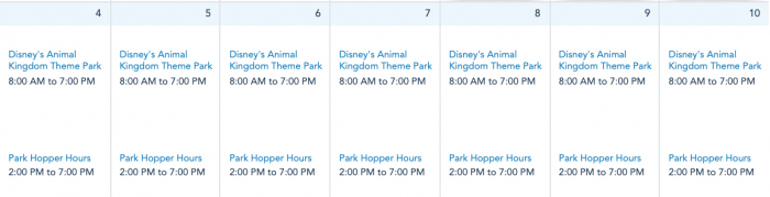 Disney’s Animal Kingdom will be open daily from 8AM-7PM next week.