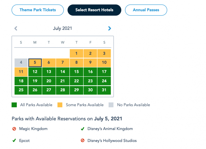 Disney Park Pass Reservation availability for guests staying at Select Resort Hotels on July 5th as of July 1st © Disney