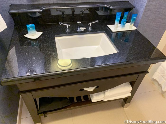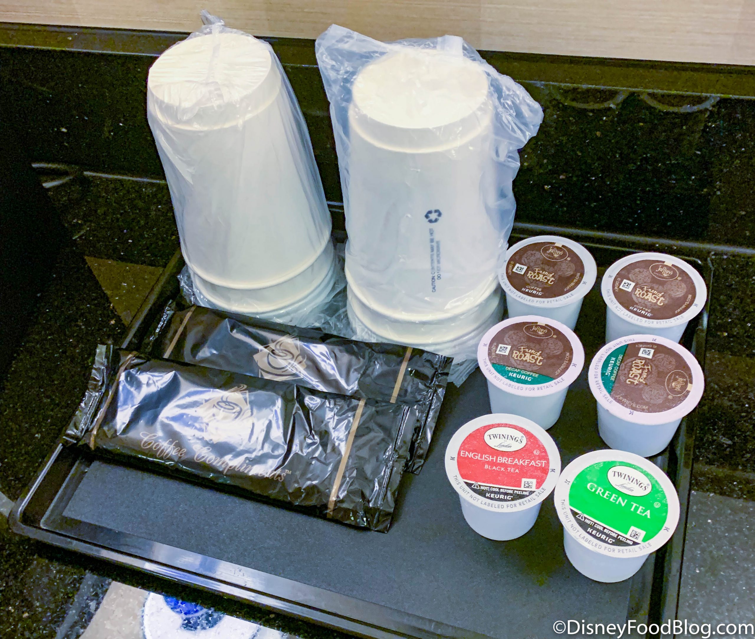 Next, let’s take a look at what the room has in terms of coffee and tea (which can be VERY essential during a Disneyland trip). There’s a coffee machine in the room as well as cups…