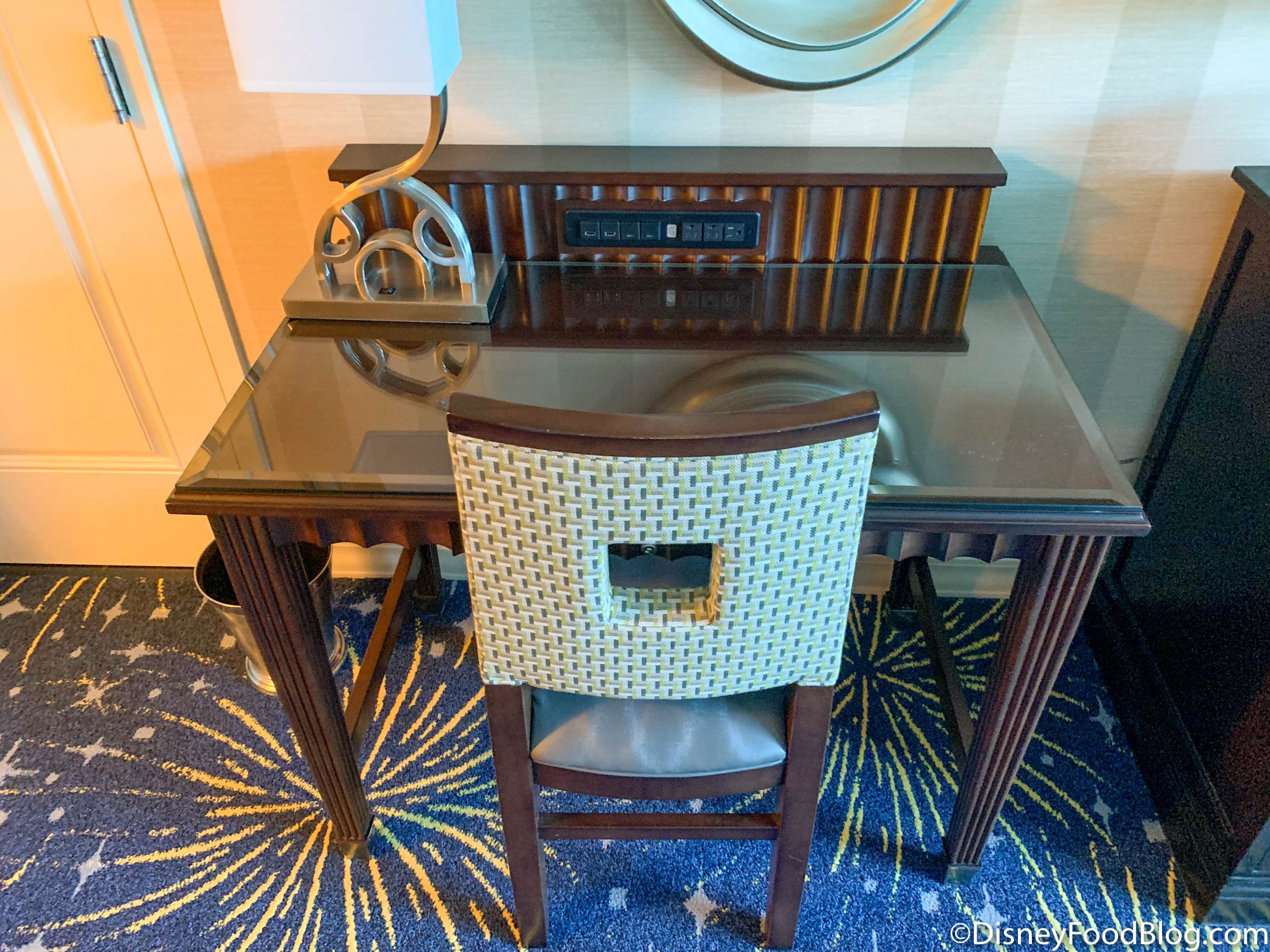 First, you’ll encounter that desk and chair set. If you’ve got to do some remote work or send a few emails, this is a great little spot.