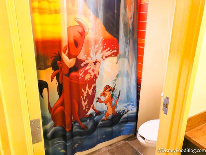 The shower curtain is a VERY fun print of Timon and Pumbaa washin’ up!