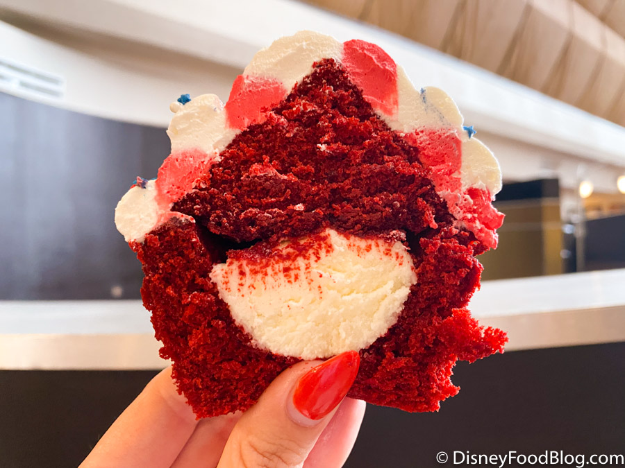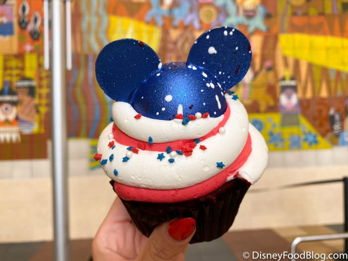 They just listed the Fourth of July Cupcake on their menu and it is available now! This cupcake has a Red Velvet cake and is filled with cream cheese icing, and topped with buttercream and a chocolate Mickey Hat.