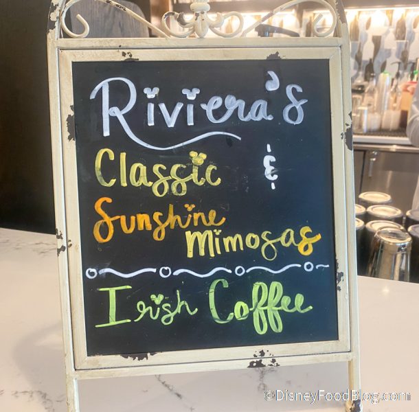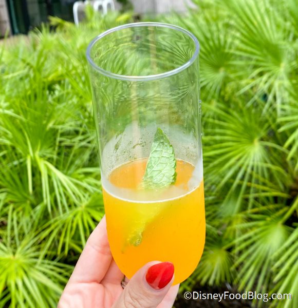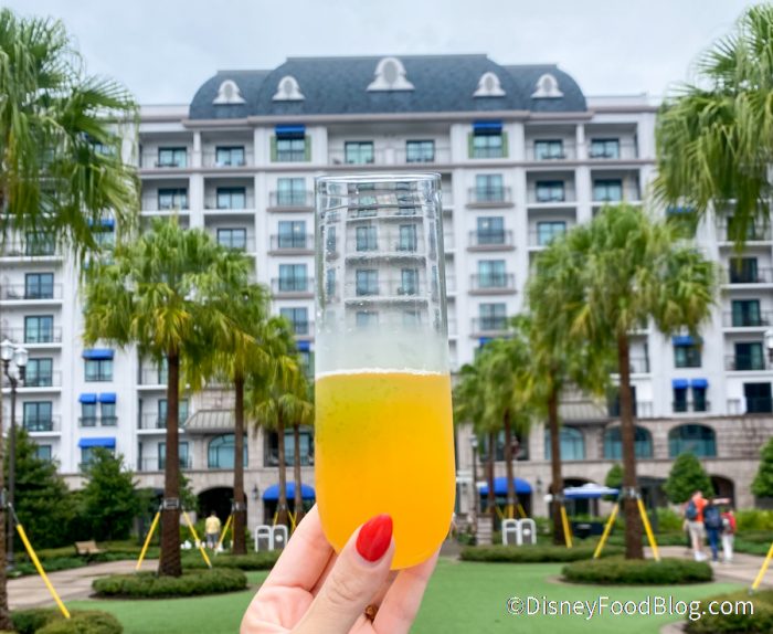 We hopped on over to Disney’s Riviera Resort today to see if Le Petit Cafe had anything new on the menu. And while we were there, we spotted a new Mimosa called the Sunshine Mimosa. It’s a Mimosa made with the famous POG Juice instead of orange juice!