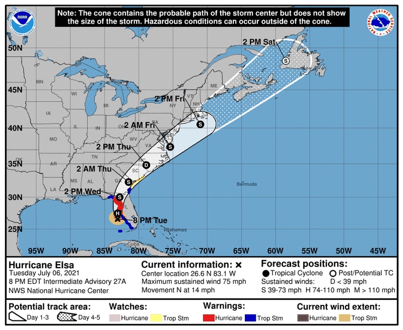 July 6th – Here is the latest on Tropical Storm #Elsa as of the 5pm Advisory. Gusty winds continue along the coast of SW Florida, where a Tropical Storm Warning remains in place. Elsewhere, heavy rainfall and an isolated tornado or two are possible through the evening hours. pic.twitter.com/dgCnHjWN8A
