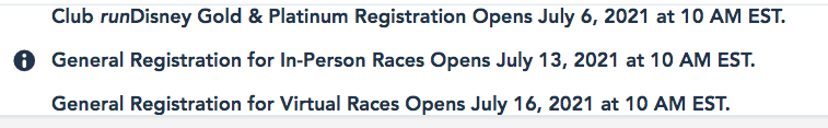 Note: Registration for Gold and Platinum was set to open this morning at 10AM EST. However, we have seen some fans online noting that they have been experiencing issues and have not yet been able to register for the races. We called runDisney and spoke to a member of their technical support team. They noted that emails with unique registration codes should be going out soon for Club runDisney members and to be sure to check your spam folder for this email. It appears registration is now open for members of Club runDisney, so be sure to check for that email!