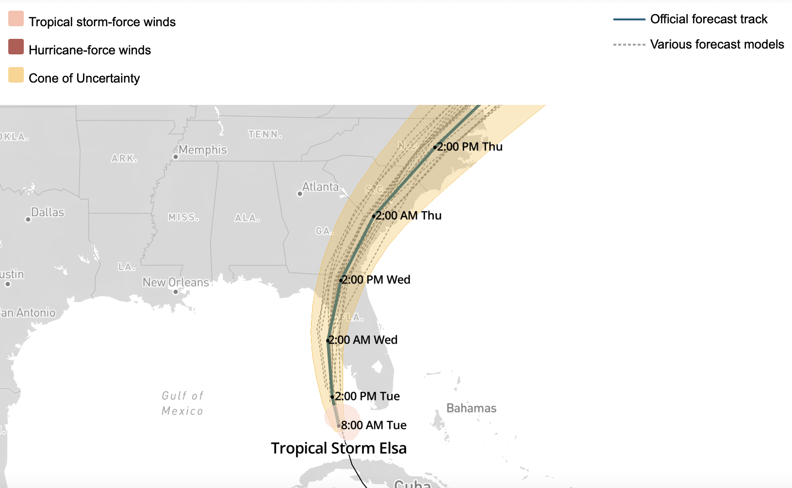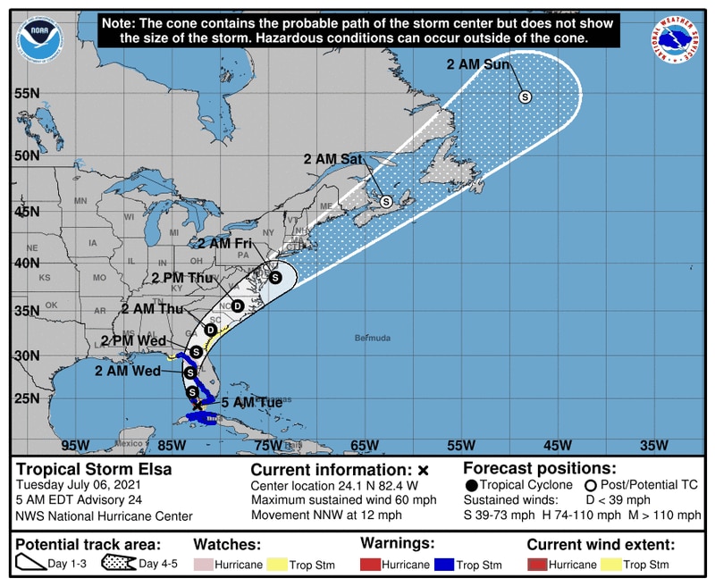Tropical Storm Elsa was 55 miles west of Key West and 240 miles south of Tampa as of Tuesday morning. Rain and wind were already impacting the Florida Keys and the storm is projected to make landfall near the Tampa area at 2AM Wednesday. Elsa’s tropical-storm-force winds are reaching up to 70 miles per hour.