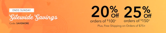 shopDisney has a sale now through this Sunday (July 11th)! You can get 20% off orders of $100 or more and 25% off orders of $150 or more! Also, there’s free shipping on orders of $75 or more! Just use the code SAVEMORE when you check out!