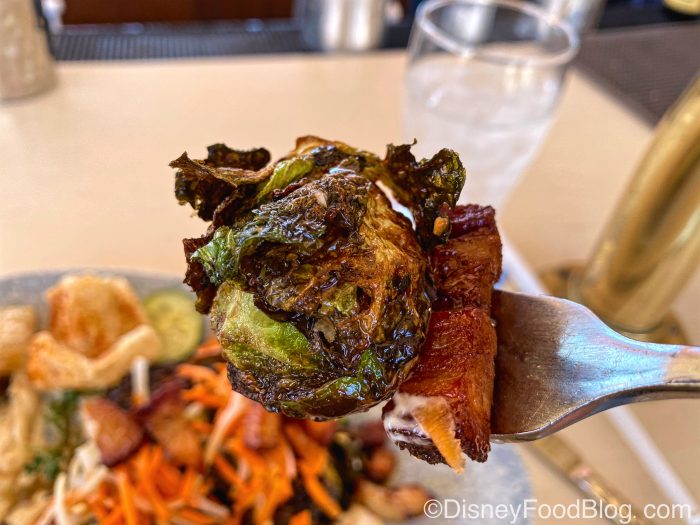 Last, but most certainly not least, the Pork Belly “Banh Mi” Brussels Sprouts with Garlic Togarashi Aïoli, Sweet Glazed Pork Belly, Pickled Carrots and Daikon, Jalapeños, Cucumbers, with Cilantro and Chicharron! For $15, this dish is a steal because it’s AMAZING! The sprouts, the aioli, the pork belly…we’re drooling just thinking about it! The flavors are savory, spicy, and full of umami!