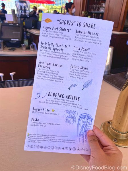 When we were seated, we got some lovely Pixar-themed menus with lots of cute sketches on them! Since Lamplight Lounge is dedicated to Pixar, it’s only fitting that the menus be works of art too!