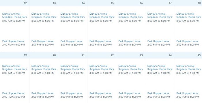 And in Disney’s Animal Kingdom, the park hours are 8AM to 6PM as they will have been in prior weeks.