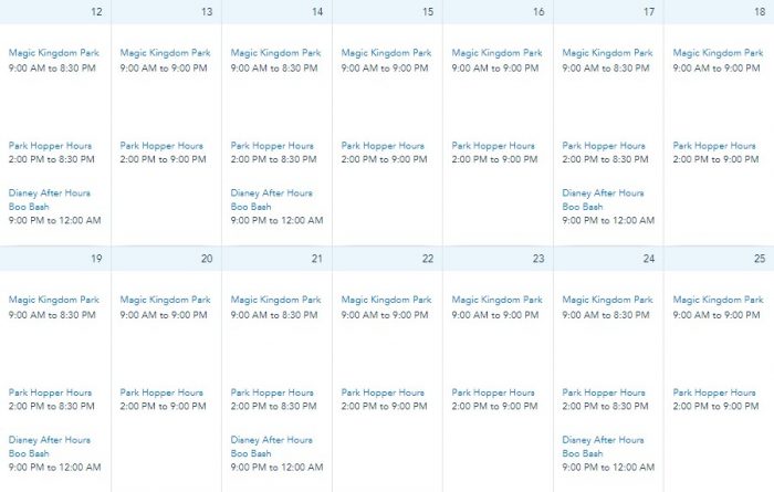 Magic Kingdom will continue to remain open from 9AM to 9PM most days. On days that have Disney After Hours Boo Bash (September 19th, 21st, and 24th), the park will close at 8:30PM. Disney After Hours Boo Bash will run from 9PM to 12AM.