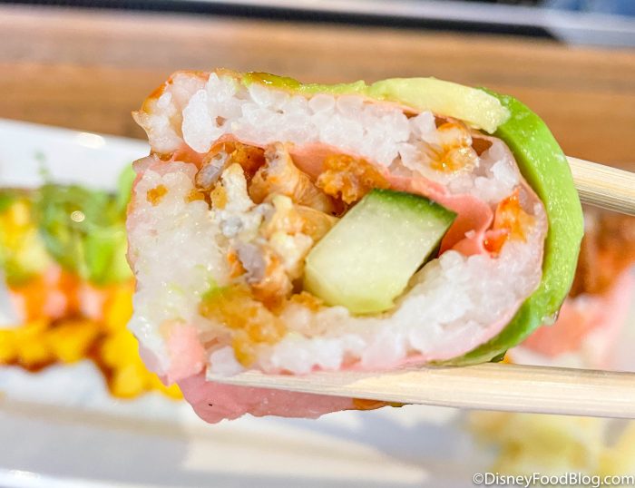 In our roll, the avocado was on the top instead of being wrapped in with the crab and cucumber, and we actually think that made for a great presentation and we still got the flavor of avocado in every bite.
